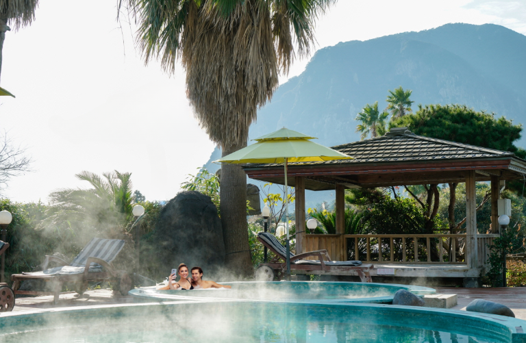 이곳의 하이라이트는 단연 야외 노천탕이에요. 웅장한 산방산을 배경으로 따뜻한 물속에 몸을 담그고 있으면 세상 부러울 게 없답니다. 낮에는 산방산의 기개를, 밤에는 쏟아지는 제주도의 별을 감상할 수 있어 가족들과 잊지 못할 추억을 만들기에 딱이에요.