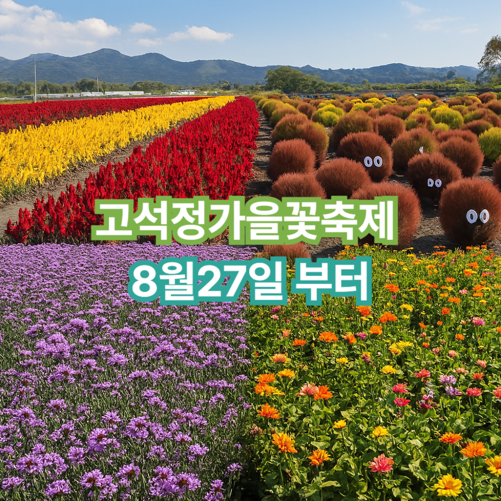 고석정가을꽃축제는 강원도 철원에서 매년 열리는 대표적인 가을 꽃 축제입니다. 이 축제는 고석정의 아름다운 자연경관과 함께 다양한 꽃들이 만개하는 시기에 열리며, 고석정은 특히 가을철에 그 매력을 발산하는데, 이 시기에 피어나는 꽃들은 그야말로 장관을 이룹니다. 넓은 꽃밭에서 인생샷을 남길 수 있고, 화관과 우산 대여, 먹거리 장터 이용이 가능합니다.