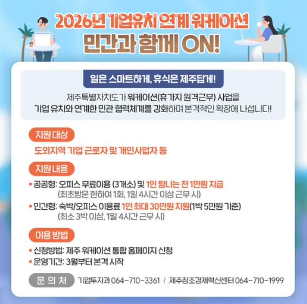 제주도는 명실상부 워케이션의 성지입니다. 2026년 3월 새롭게 시작되는 '제주 워케이션 특화 사업'은 개인 신청자에게도 문호가 활짝 열려 있습니다. 서귀포와 제주시 곳곳에 마련된 공유 오피스를 무료로 이용하고, 협약된 숙소에서 묵을 경우 매달 일정 금액을 환급(페이백)해 줍니다. 아침엔 서핑, 낮엔 업무, 저녁엔 흑돼지 파티! 이 모든 게 지원금으로 가능하다는 게 대박이죠?
