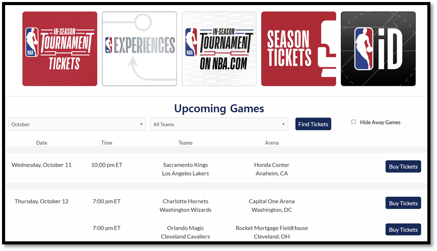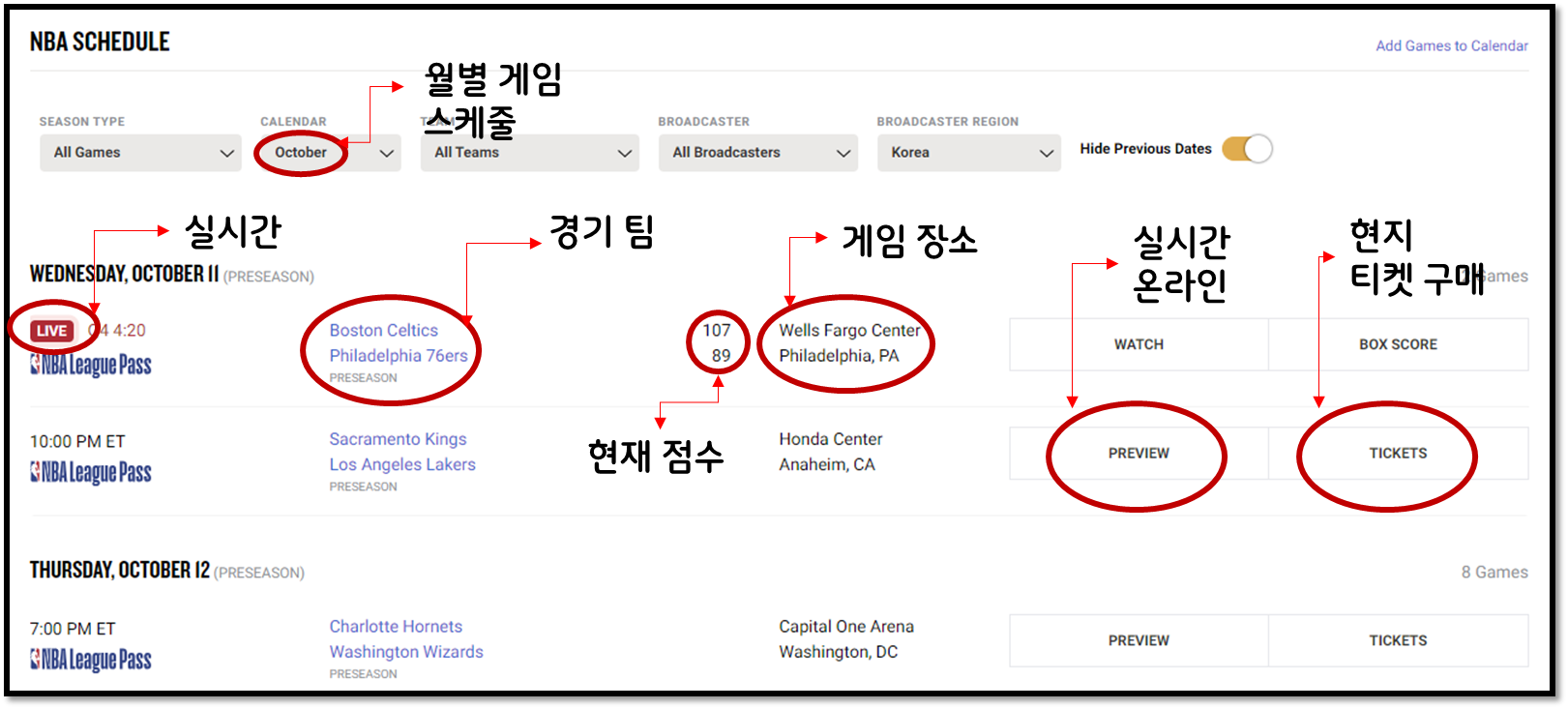 NBA 공식 웹사이트를 통해 각 팀별로 경기 일정을 확인하고, 원하는 경기의 티켓을 직접 구매할 수 있습니다.