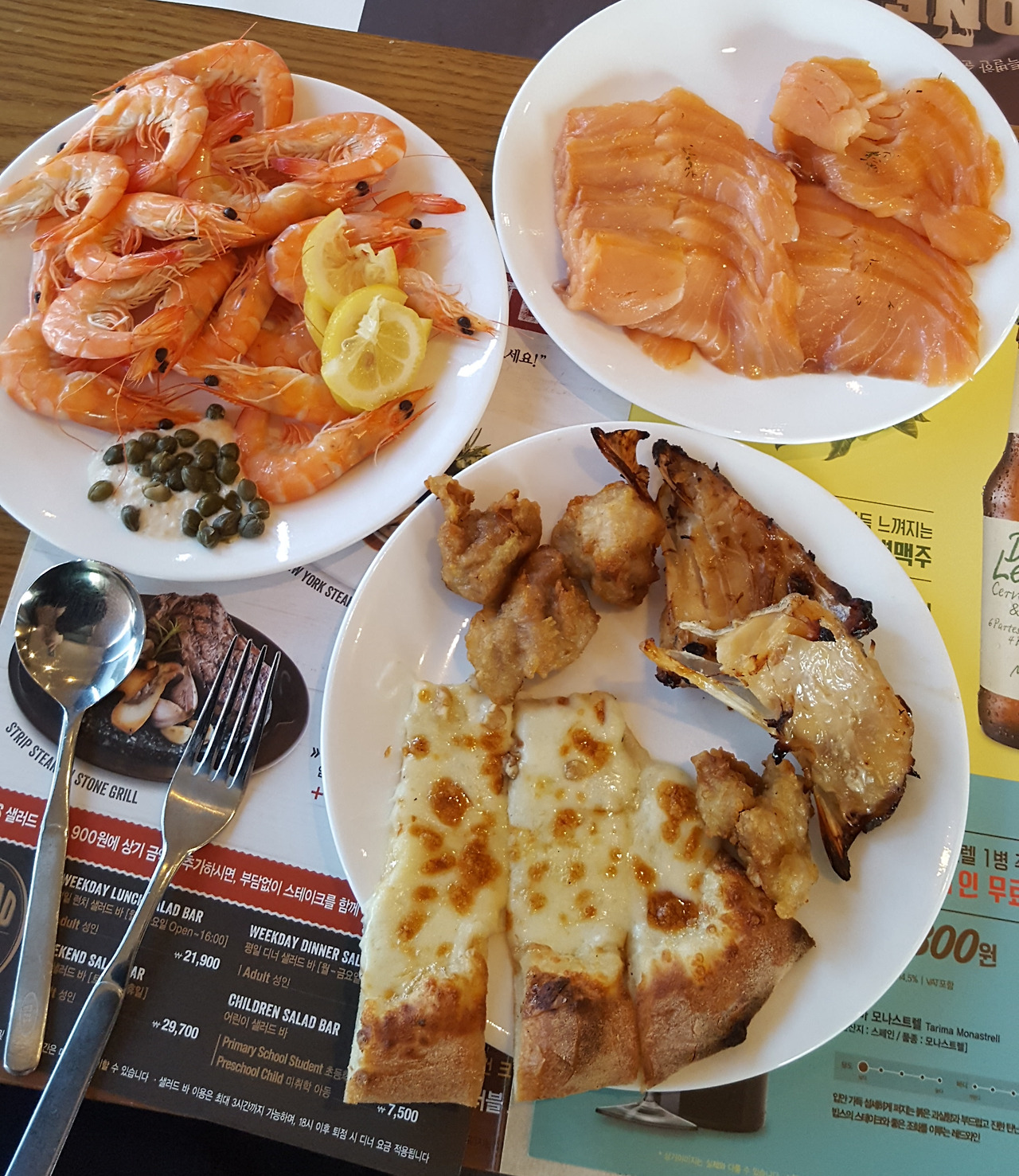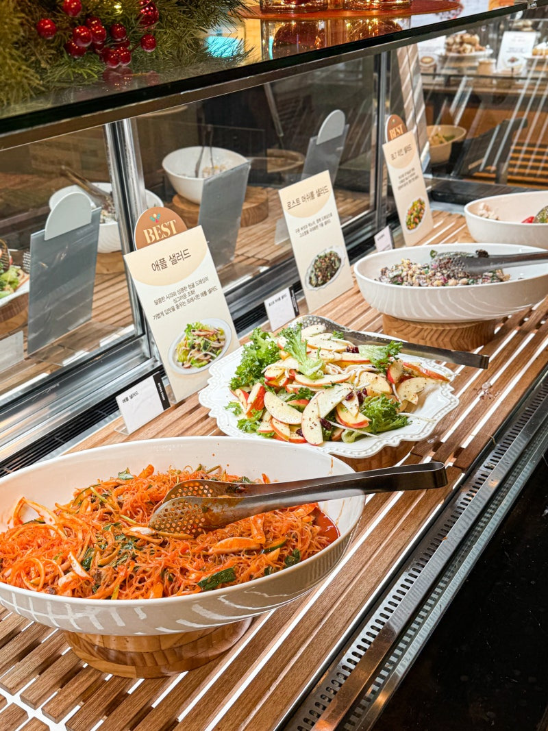 - 메뉴 포인트 - 샐러드·핫푸드·그릴(스테이크/피자/파스타)·디저트 구성.