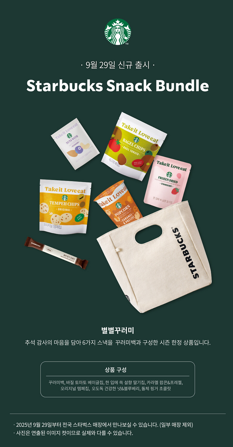 - 상품 개요: 스타벅스 추석 시즌 한정 패키지로, 에코백(캔버스 소재, 텀블러 홀더/내부 포켓 여부는 점포·차수별 상이) + 스낵 6종 내외로 구성되는 ‘별별꾸러미(꾸러미백)’. 실사용 용도는 도시락가방·서브 토트로 후기 다수.