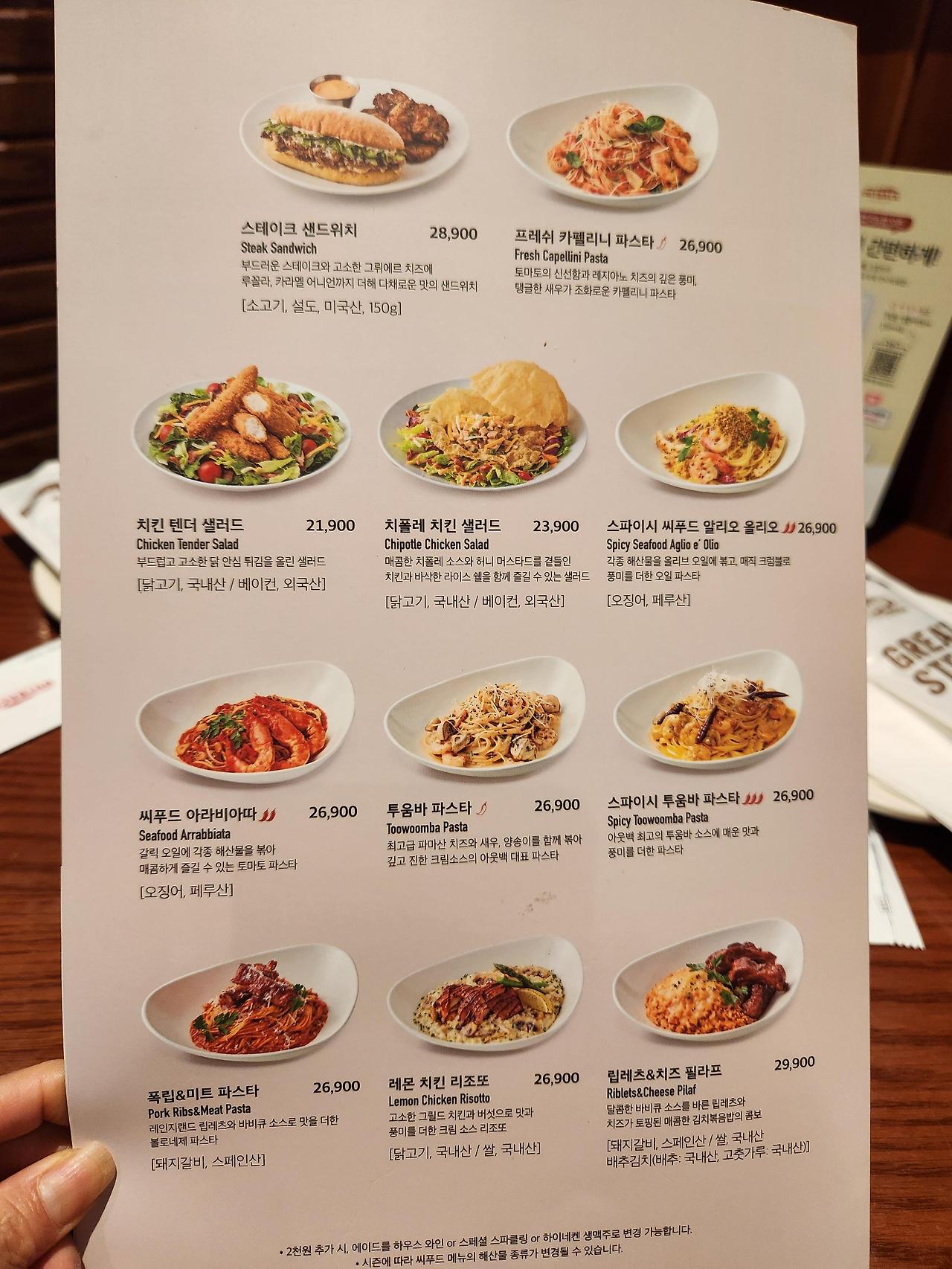 구성/추천: 1인 런치 플레이트, 파스타+스테이크 콤보, 2·3인 세트(수프/샐러드/메인/에이드) 구성이 인기예요. 인원수보다 한 단계 낮은 세트에 단품을 한두 개 추가하면 가성비가 좋아요. 수프↔샐러드 교체, 사이드 업그레이드 가능 여부도 확인하세요.