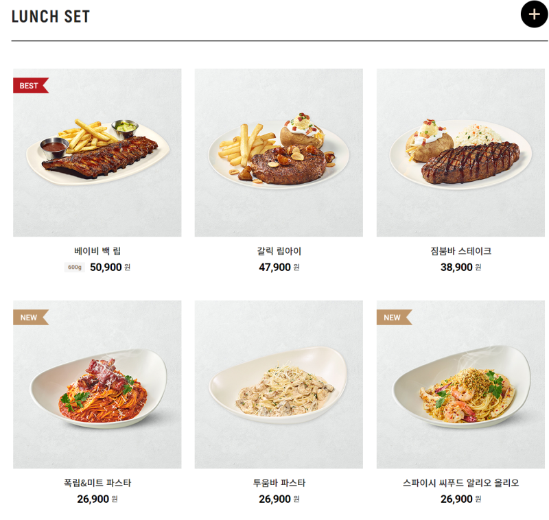 BBQ 립과 리브아이 스테이크, 그리고 시즐링 스테이크 등 다양한 스테이크 옵션이 있습니다. 또한, 파스타 메뉴도 다양하게 준비되어 있어, 파스타를 좋아하는 분들에게도 좋은 선택이 될 것입니다. 런치 세트 메뉴는 보통 수프와 빵, 음료가 포함되어 있어 더욱 풍성한 식사를 즐길 수 있습니다.