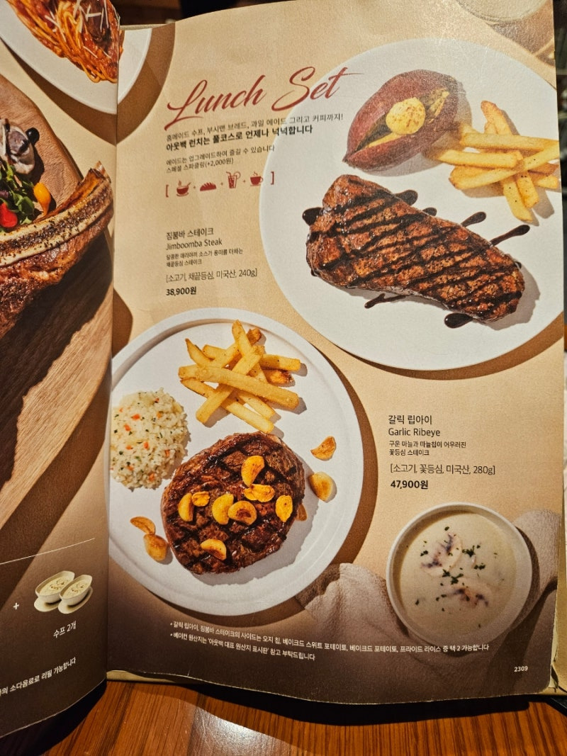 점심 세트 메뉴의 가격과 구성을 확인할 수 있습니다. 특히, 짐부움바 스테이크와 갈릭 립아이 스테이크는 많은 사람들이 추천하는 인기 메뉴입니다.