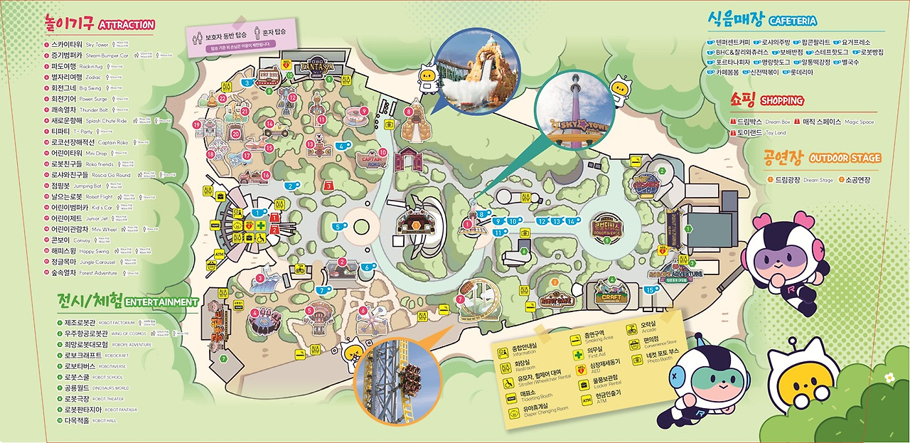 - 인기 라이드 공략: 개장 직후 또는 저녁 시간에 스릴 라이드→가족 라이드→실내 체험 순. 키 제한 미리 확인하고, 유모차 대여·보관 위치 체크하면 동선이 빨라집니다.