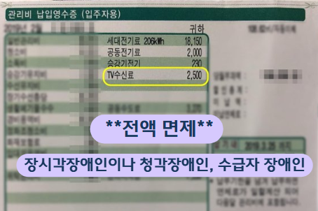 | TV 수신료 | 시각/청각 장애인 가구 | 2,500원 전액 면제 | 한전 / KBS 고객센터 | 주거지당 1대 |