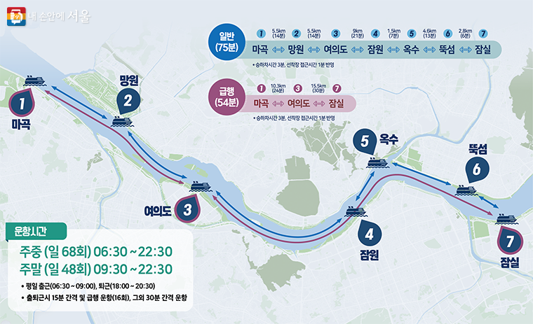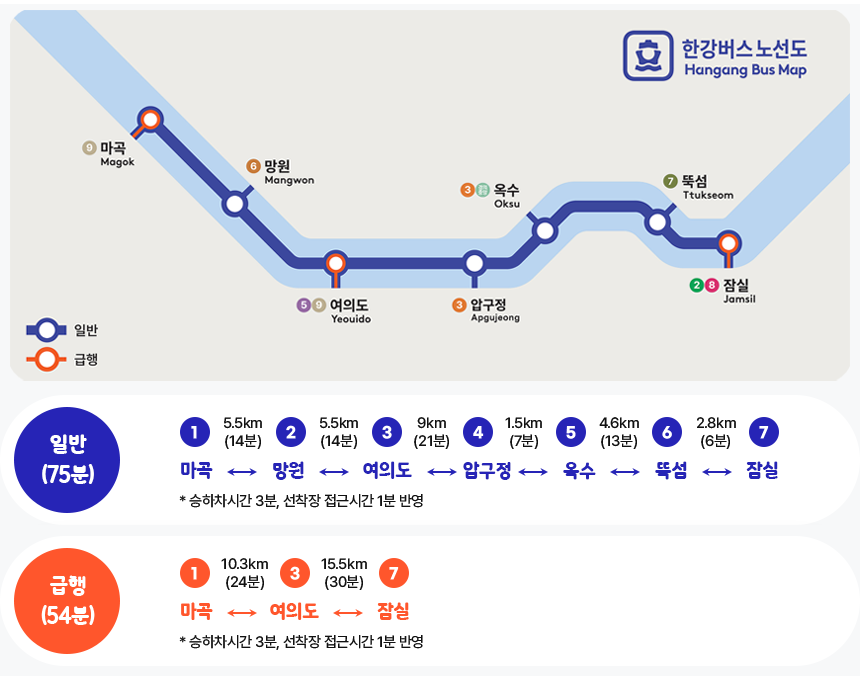대표 구간 예시: 잠실 ↔ 여의도 약 50분 내외. 환승형 단거리 구간과 관광형 중거리 구간이 혼재합니다. 주말·야간에는 야경 코스 중심 편성 증가.