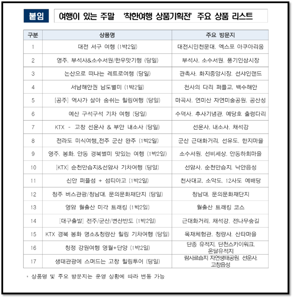 문화체육관광부와 한국관광공사는 '여행이 있는 주말' 캠페인과 함께 '착한여행 상품기획전'을 12월 3일까지 운영하며, 이를 통해 올해 특별재난지역인 단양, 순천, 영주 등 20여 곳에 활기를 불어넣고, 11월의 여행 비수기 동안 국내 여행업계를 지원하려고 합니다.