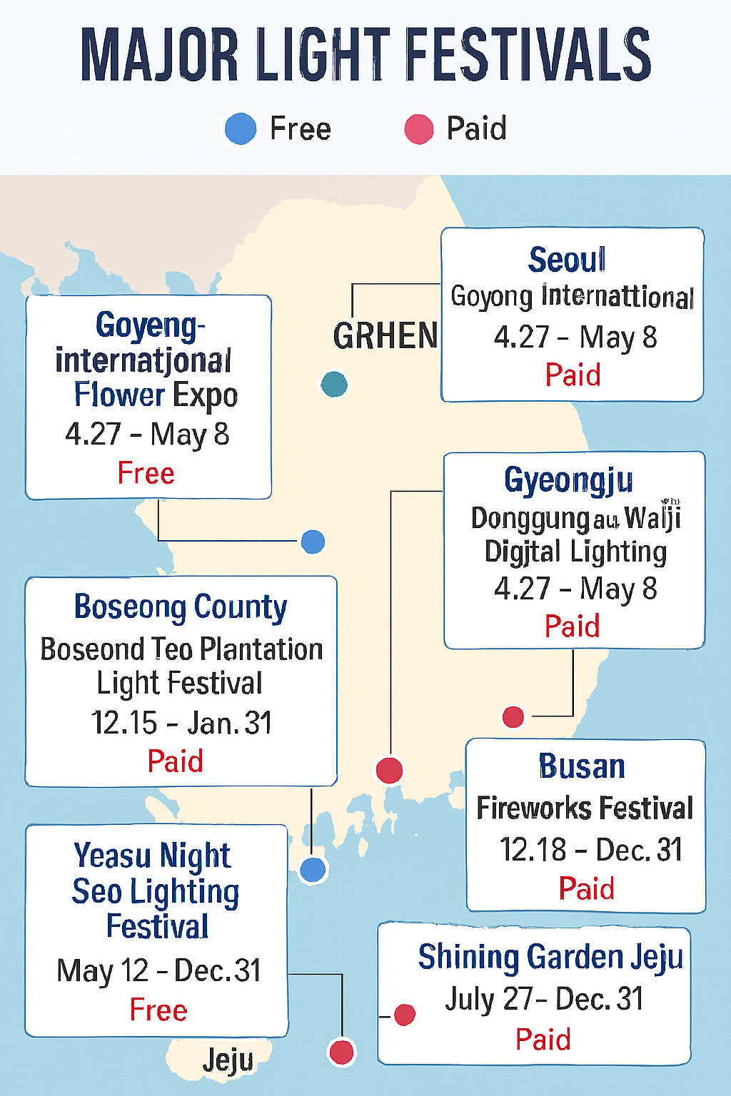 📌 [전국 주요 빛축제 무료/유료 거점 도시와 기간을 표시한 요약 지도]