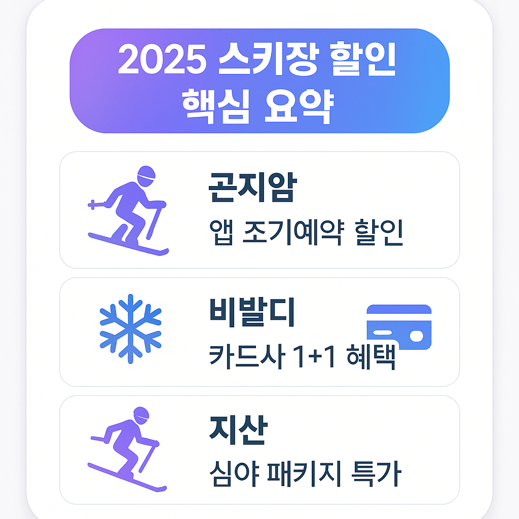 2025년 스키 시즌은 고물가 상황 속에서도 다양한 제휴 마케팅 덕분에 여전히 합리적인 여행이 가능합니다. 카드사 할인과 조기예약이라는 두 가지 무기를 잘 활용한다면, 이번 겨울 스포츠 여행은 성공적인 재무적 호재로 기억될 것입니다. 본문에서 제안한 스키장별 맞춤 전략을 통해 즐겁고 경제적인 시즌을 보내시길 바랍니다.