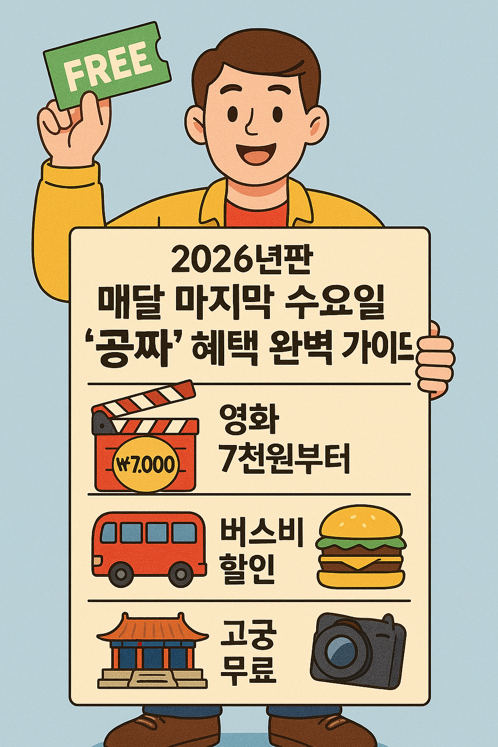 "고물가 시대, 문화생활비가 부담스러우셨나요? 매달 마지막 수요일은 나라에서 정한 '문화가 있는 날'입니다. 영화, 전시, 스포츠, 공연을 반값 혹은 무료로 즐길 수 있는 이 놀라운 혜택들을 8,000자 분량의 상세 설명으로 모두 정리해 드립니다. 이 글 하나만 저장해두시면 1년 내내 재테크 고수가 될 수 있어요!"