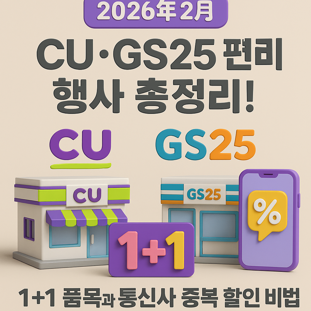 💡 2026년 2월은 설 연휴와 밸런타인데이가 겹쳐 편의점 행사가 역대급으로 풍성합니다! CU와 GS25의 1+1 주요 품목부터 통신사 멤버십을 활용해 반값보다 더 저렴하게 구매하는 '대박' 비법을 지금 공개합니다.