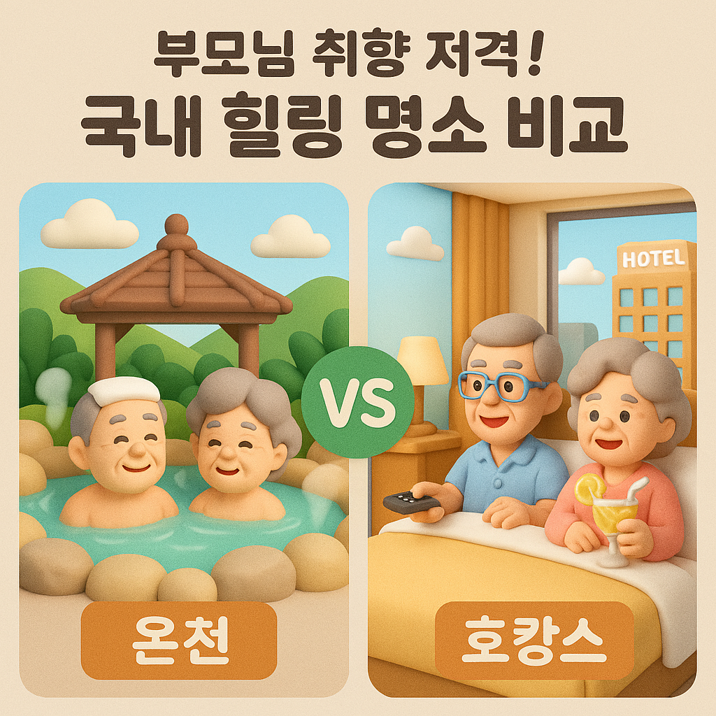 부모님의 성향에 따라 선택지는 갈립니다. 뜨끈한 물에 몸을 담그는 **온천**이냐, 세련된 서비스와 조식을 즐기는 **호캉스**냐! 현재 예약 가능한 대표 명소 5곳을 비교해 보았습니다.